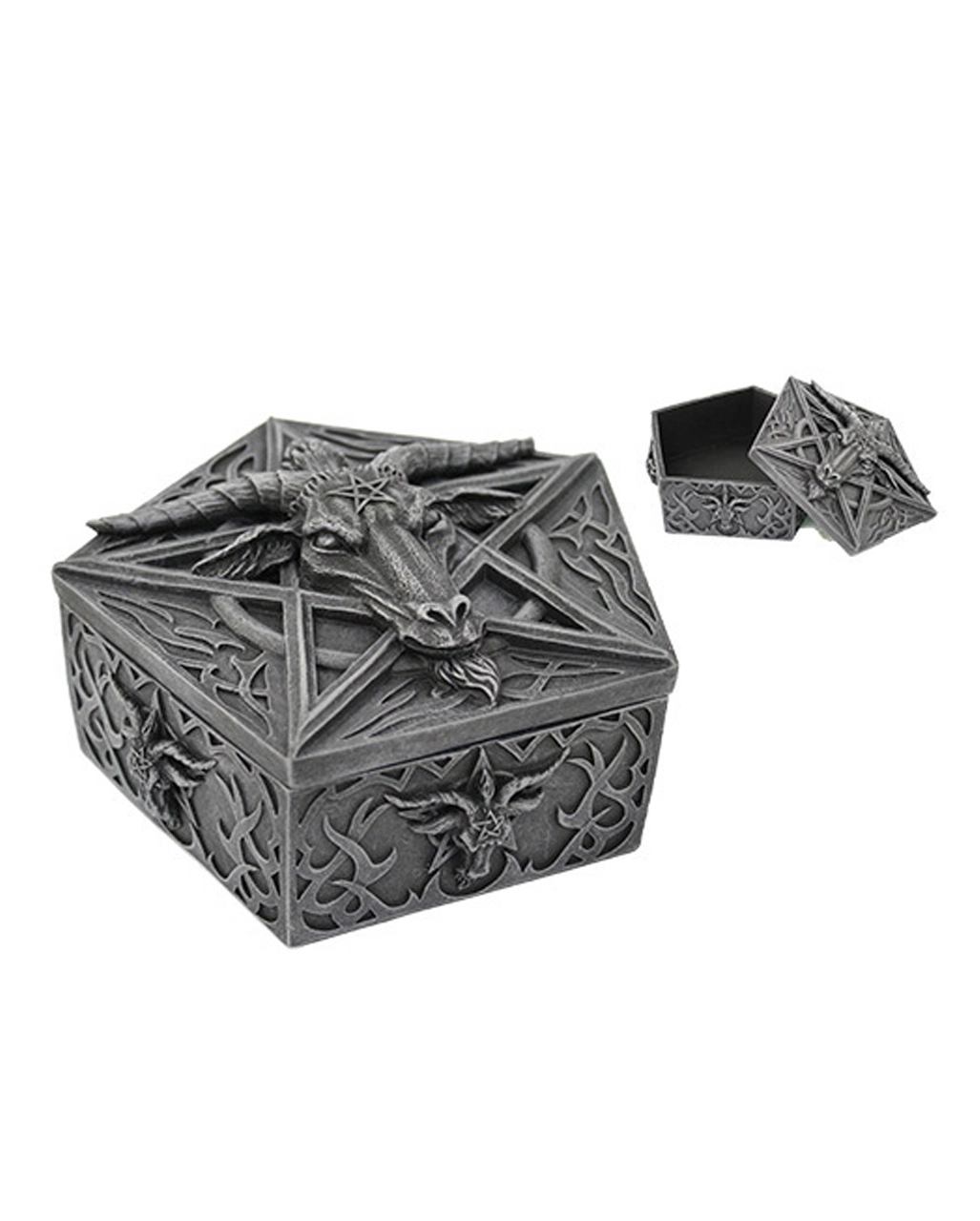 Baphomet wacht über deine Habseligkeiten. Mit unserer okkulten Schmuckdoese mit Deckel erhältst du ein mystisch anmutendes Versteck für deinen Kleinkram. Die Baphomet Schatulle mit Deckel ist ein echter Eyecatcher, der jeden staunen lässt. Mit detailliert gearbeiteten Symbolen und Figuren bietet die Baphomet Box eine besonders stilvolle Aufbewahrungsmöglichkeit für Schmuck und Kleinigkeiten. Als Gothic Wohnaccessoire ist unsere okkulte Geschenkidee ein echtes Highlight!