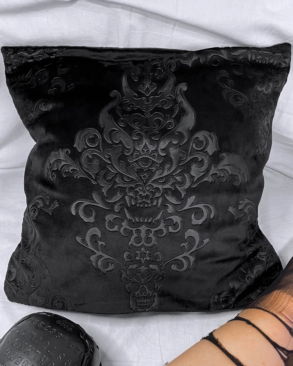 Der Daemon Kissenbezug KILLSTAR ist ein Must-have für Fans okkulter Deko Accessoires. Zum einen sehen wir auf dem weichen Kissenbezug ein florales Muster, das mit dämonischem Ambiente überzeugt. Verliere dich in der mystischen Optik oder genieße die weiche Damast-Oberfläche des stilvollen Gothic Kissens. Der Bezug ist quadratisch und besitzt einen Reißverschluss, um das Kissen schnell rein und wieder rauszupacken. Weitere düstere Deko Accessoires wie die KILLSTAR Tagesdecke Stellar findest du hier im Shop.
