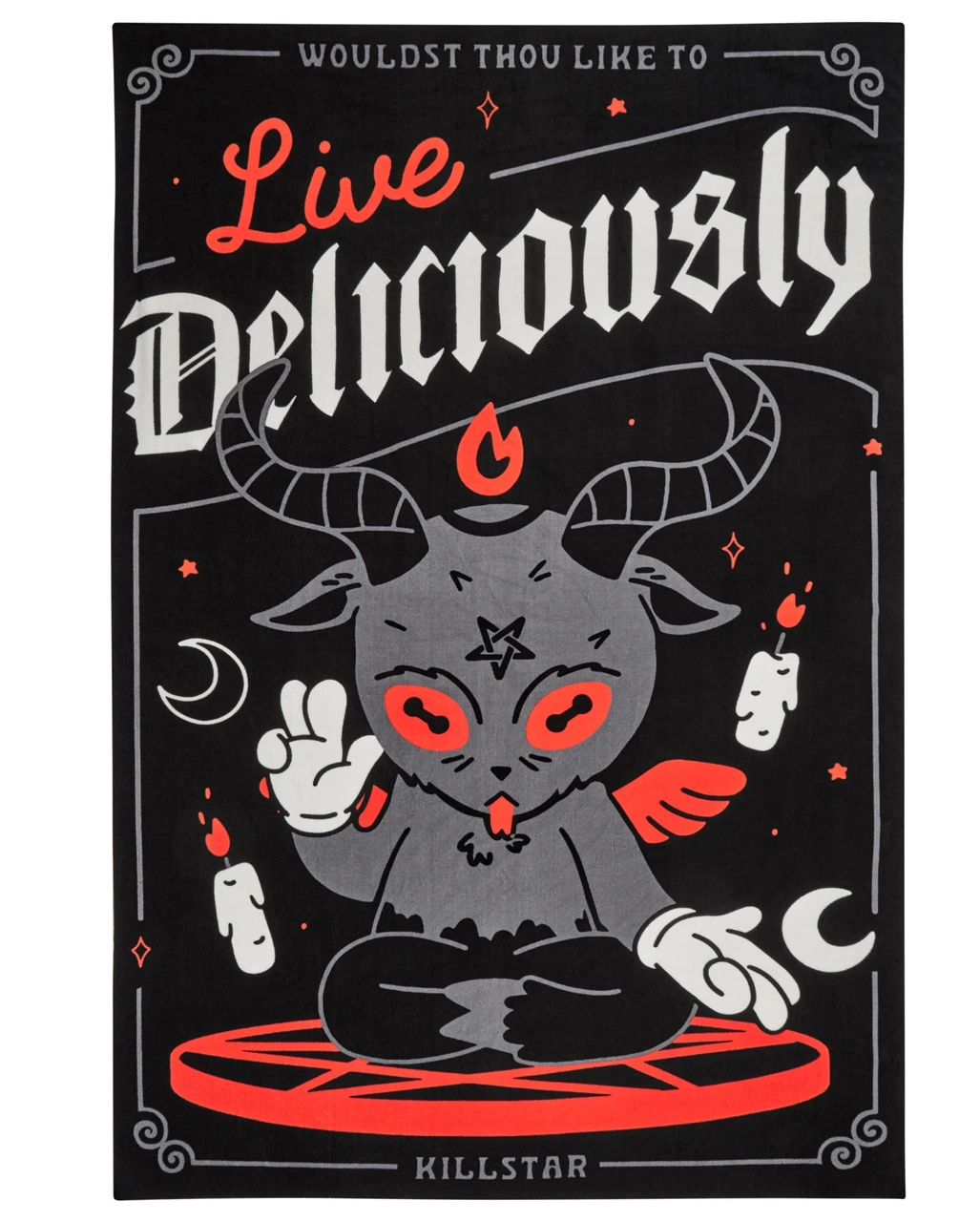 Unser Deliciously Badetuch von KILLSTAR ist ein okkultes Strand-Accessoire. Die Grafik seigt die gehörnte Sabbat-Ziege im Schneidersitz, umgeben von mystischen Symbolen, Kerzen und Monden. Die Aufschrift „Would Thou Like To Live Deliciously“ ist in verschnörkelter Schrift zu lesen. Das Gothic Strandtuch von KILLSTAR ist natürlich nur eines von vielen coolen KILLSTAR Accessoires. Entdecke auch unsere I’m Magic Kuscheldecke XL KILLSTAR oder den Under My Spell Regenschirm KILLSTAR