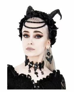 Der einzigartige Kostümschmuck hat als Hauptelement einen schwarzen Engel mit ausgebreiteten Flügeln. Zwischen Engel und Reif befindet sich ein Edelstein, der in einem extravagant breiten Rahmen mit floralen Ornamenten steckt. Der Wicca Kostümschmuck lässt sich sehr gut mit unserem Gothic Halsband aus Spitze mit Perlen ergänzen.