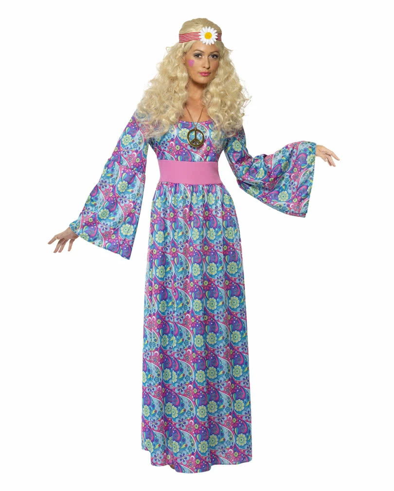 Verkleide dich jetzt als verklärtes Hippie Girl der Blumenkinder Generation und demonstriere mit deinem Kostüm den lässigen Chic der 68er. Es war die Zeit der Studentenbewegung, der freien Liebe als Kommunarde und fantastischer Musik, die beim Woodstock Festival gefeiert wurde. Lange wallende Kleider mit schrillen Blumenmuster und lange Trompetenärmel waren genauso in, wie lange Haare oder die Afrofrisur. Mit dem bunten Flower Child Hippie Kostüm bist du perfekt für eine Hippie Party oder eine Woodstock-Mottoparty angezogen.
