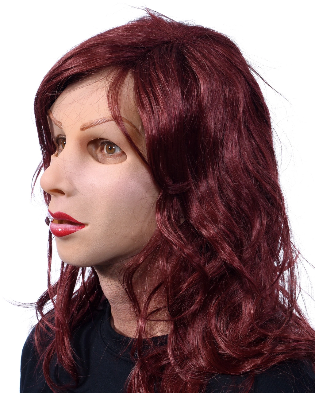 Die Frauen Latex-Maske mit Langhaarperücke ist aus besonders hochwertigem softem Latex von Hand gefertigt, passt sich deinen Mimiken an. Die gewellten langen Kunsthaare der Karnevalmaske sind rot & haben einen natürlichen Glanz. Die rote Langhaar-Perücke ist auf ein Netz geknüpft mit Seitenscheitel & elegantem Pony mit Außenwelle. Die Crossdresser-Maske hat ausgesparte Augen & einen kirschroten, lasziv geöffneten Kussmund. Zu der von Hand bemalten Künstler Latex-Maske empfehlen wir dir ein Paillettenkleid lang schwarz und die Red Satin Bordello High Heels.