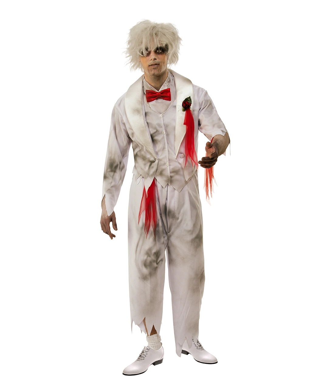 Das Gespenster Bräutigam Kostüm für Herren ist eine geniale Halloween Verkleidung, die dir viel Aufmerksamkeit bescheren wird. Der schicke weiße Hochzeitsanzug ist sicher einmal sehr edel gewesen. Der Frack mit Weste und das Fake-Hemd mit Fliege zeugen von einem ganz besonderen Modell. Doch leider hat das Massaker am Hochzeitstag Schmutz und sehr viel Blut auf dem schönen Anzug hinterlassen. Zudem ist deine Hose zerrissen. Passend zu deinem blutigen Gespenster Kostüm kannst Du auch das stilechte Filmblut Gel kaufen und dein Gesicht damit verzieren. Dann sieht es echter aus.