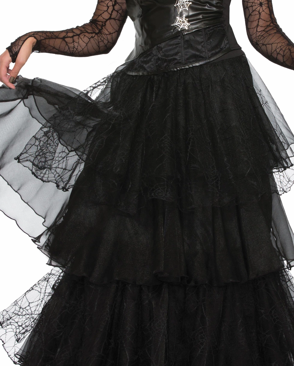 Das Gluthexe Hexenkostüm ist ein Kostüm, welches mit vielen Details überzeugt. Das figurbetonte Hexenkostüm besteht aus einem Oberteil in Korsagen-Optik. Es hat keine Ärmel und zeigt somit viel Haut. Der Rock besteht aus schwarzen Tüll-Lagen, von denen einige mit einem Spinnweben-Design verziert sind. Das Material ist leicht dehnbar und sehr bequem. Du bekommst das Gluthexe Hexenkostüm in Größe 36/38 und 40/42. Hierzu passt die Juwelen Spinnenhexe Perücke