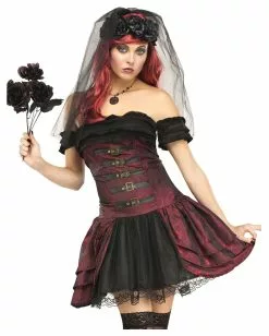 Das Gothic Vampirbraut Kostüm zu Fasching verfügt über drei Kostümteile, ein kurzes Minikleid, ein Paar schwarze Puffärmel und einen Chiffon-Schleier. Das schulterfreie, bordeauxrote Gothic Vampirbraut Kleid hat am Brustteil einen raffinierten Einsatz in Schwarz, zu dem die separaten Puffärmel in Schwarz vollkommen passen. Das schwarze Kostümoberteil der Vampirbraut wurde mit drei Gürtelriemen und feinen Blumen-Printen verziert. Der Chiffon-Rockteil ist mehrlagig und er hat zudem einen sehr fein verarbeiteten Saum aus schwarzen Spitzen. Schließlich ergänzt der Schleier das Gothic Vampirbraut Kostüm, das dieser aus schwarzem Chiffon gefertigt wurde. Für Dein Vampirbraut Kostüm brauchst Du noch unbedingt einen Brautstrauß mit Künstliche Rose schwarz-weiß und ein Paar extravaganten Samtstiefel mit goldfarbenen Knöpfen, die Du mit dem Vampirbraut Kostüm und anderen Faschingskostüm Accessoires bei Karneval-Universe.de bestellen kannst.