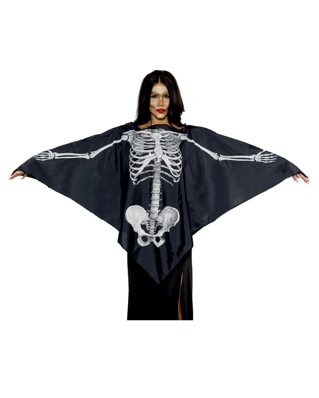 Schwarzer Poncho mit Knochengerippe als Motiv