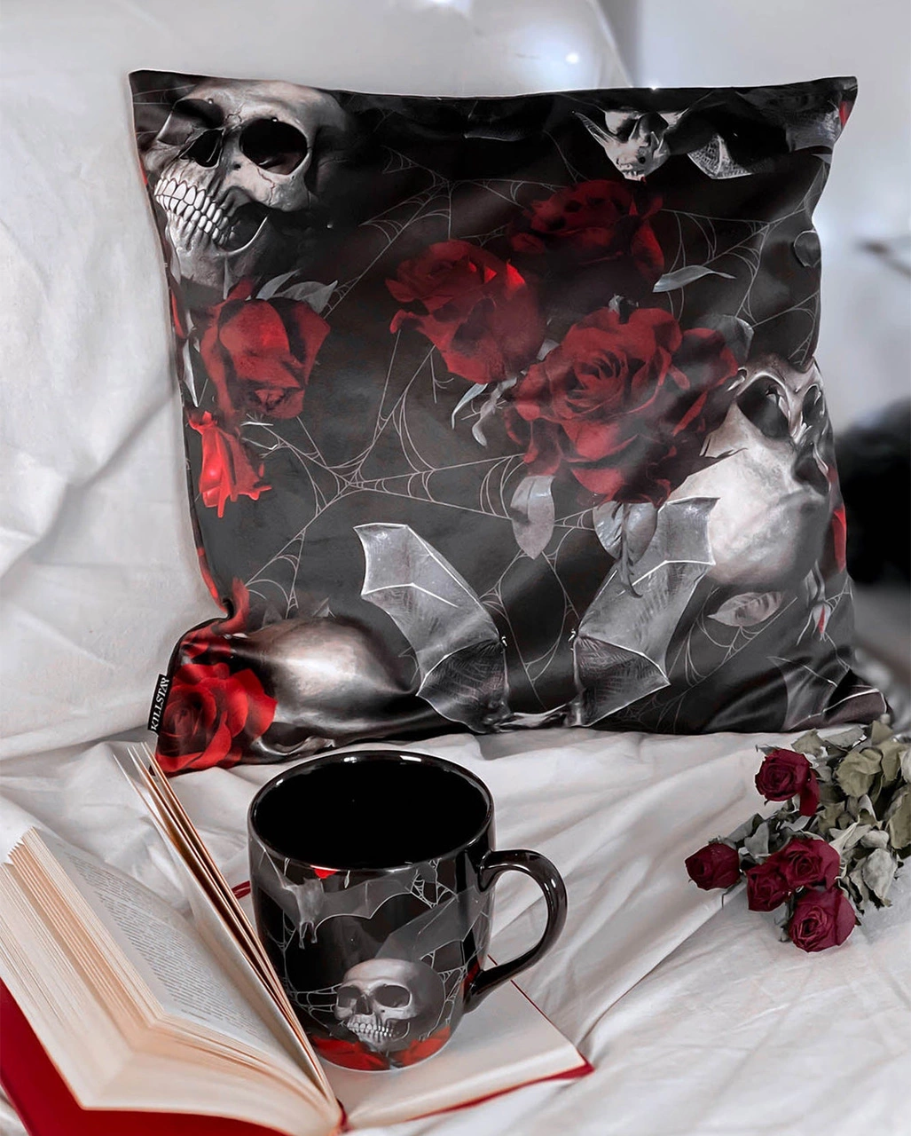 Die Haunted Garden Kissen Hülle KILLSTAR verbreitet mystisches Flair auf deiner Couch. Oder in deinem Bett. Wo immer du unser (alp-)traumhaftes Gothic Kissen als Deko verwendest. Genieße den Anblick von Totenköpfen, Fledermäusen und Rosen. Sie nehmen dich mit in den verwunschenen Garten, ein Ort, an dem dunkle Träume wahr werden können. Hörst du die Geister der Toten leise flüstern?