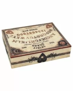 Das Hexenbrett ist seit jeher ein mächtiges Werkzeug, um Geister und Dämonen zu beschwören. Deshalb erhältst du bei uns nun eine Ouija Schmuckdose im antiken Design. Das Hexenbrett Schmuckkästchen ist mit aufwendigen Barockmustern und verzierten Planchetten eingefasst. Der naturfarbene Hintergrund ist künstlich gealtert und hat das Alphabet in einem Bogen auf der Oberseite aufgemalt. Seitlich des Schriftzugs von „Goodbye“ zeigen zwei verschnörkelte Planchetten zur Mitte hin, als ob sie bereit wären, sich zu bewegen. Das Spirit Board Motiv des mystischen Schmuckkästchens beinhaltet zudem die Zahlen 0 bis 9 und die Worte YES und NO sowie eine Warnung, die Box mit Vorsicht zu verwenden.