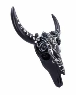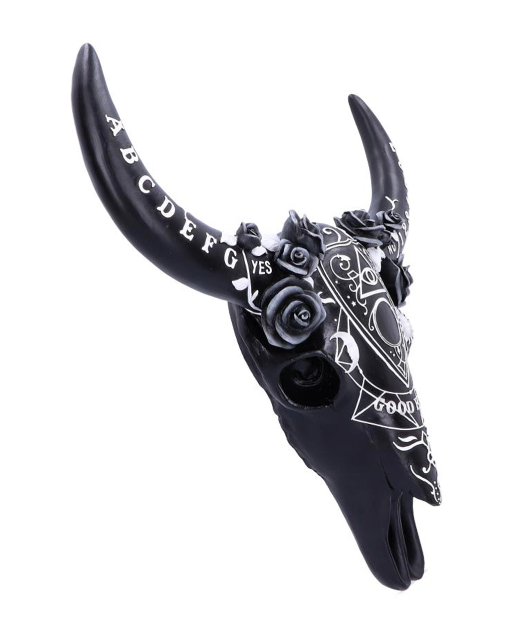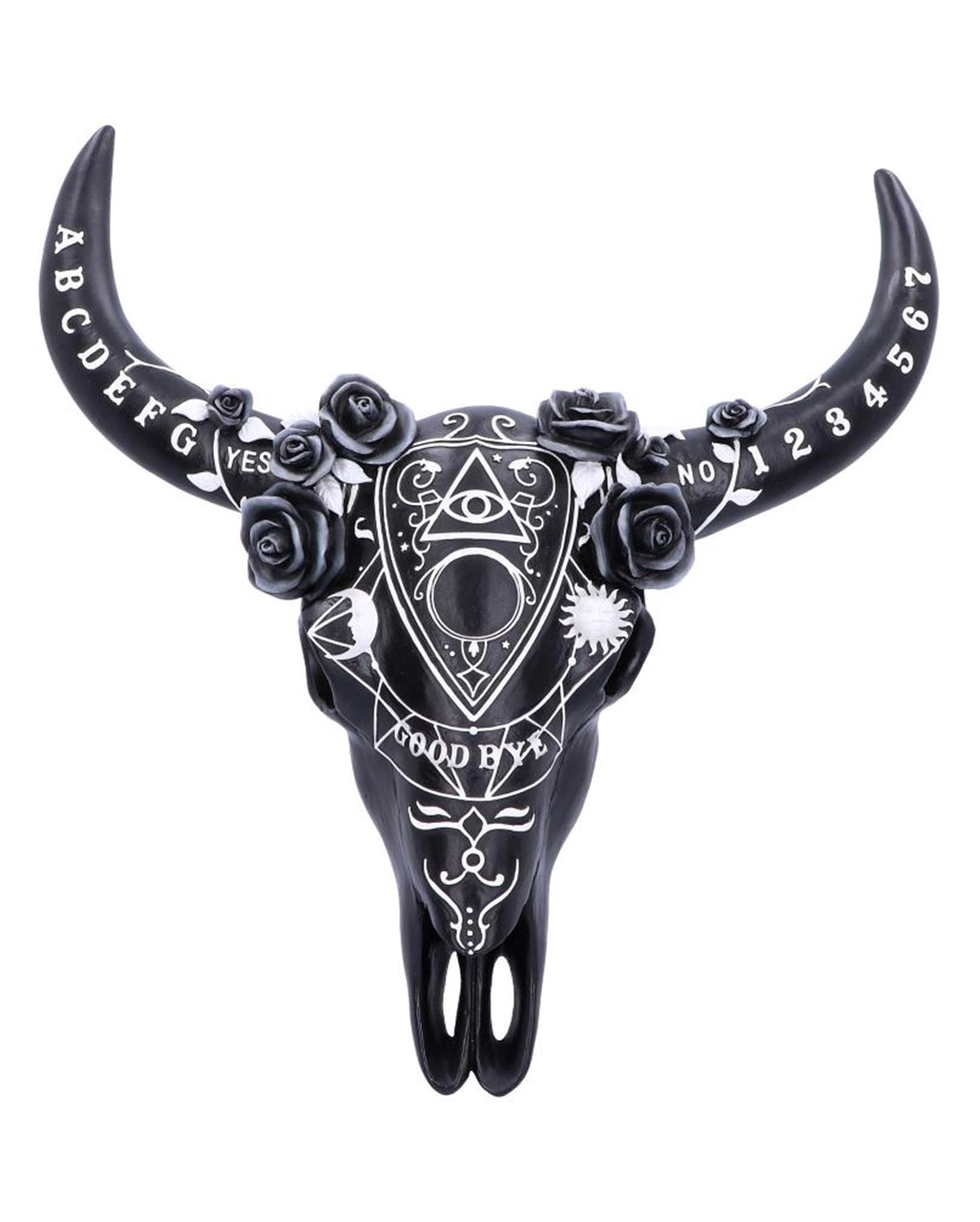 Morbide, schaurige Deko als alternatives Wohnaccessoire für Liebhaber des Makabren und Ungewöhnlichen. Kleine schwarze Rosen befinden sich auf der Rückseite eines Büffelschädels, während ein Teil des Alphabets in Weiß auf seinem linken Horn und die Ziffern 1 bis 7 auf dem rechten zu sehen sind. In der Mitte des Schädels prangt der Umriss einer Planchette mit einem dreieckigen Augenschmuck. Über dem Nasenrücken steht das Wort „Goodbye“ geschrieben, während Mond und Sonne den ständigen Kreislauf des Lebens symbolisieren.