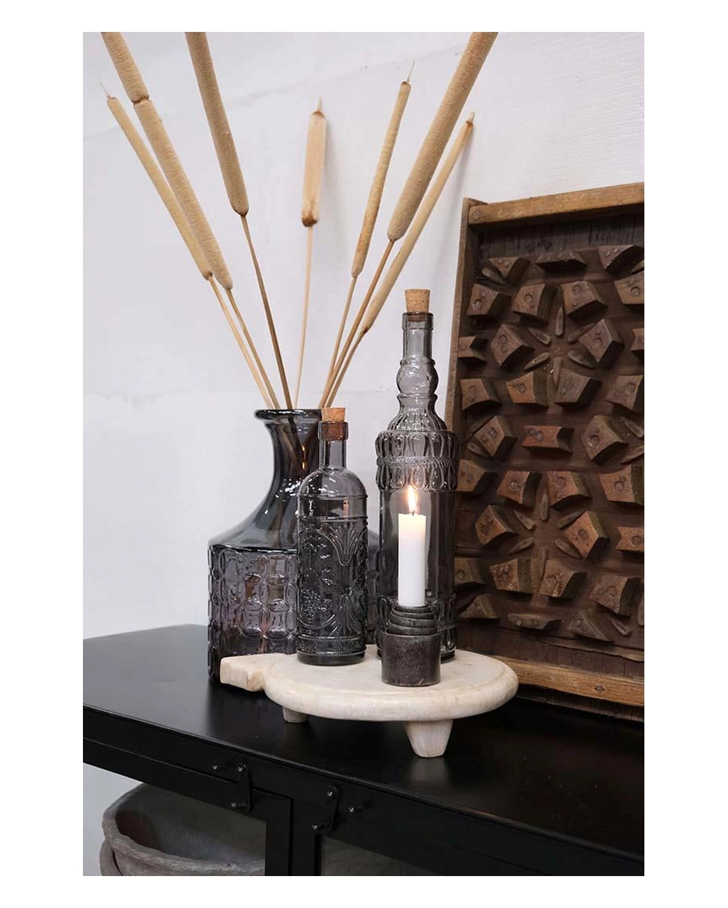 Graue Glasflasche als Gothic Tischdeko