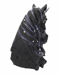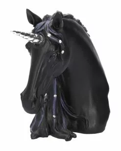 Diese fantasievolle Einhorn-Büste steckt voller Magie. Das schwarze Einhorn blickt mit tiefschwarzen, seelenvollen Augen nach vorne. Das silberne Horn ragt spiralförmig aus dem Kopf heraus, und die mit Juwelen besetzte Mähne und der Bart sind violett gefärbt.