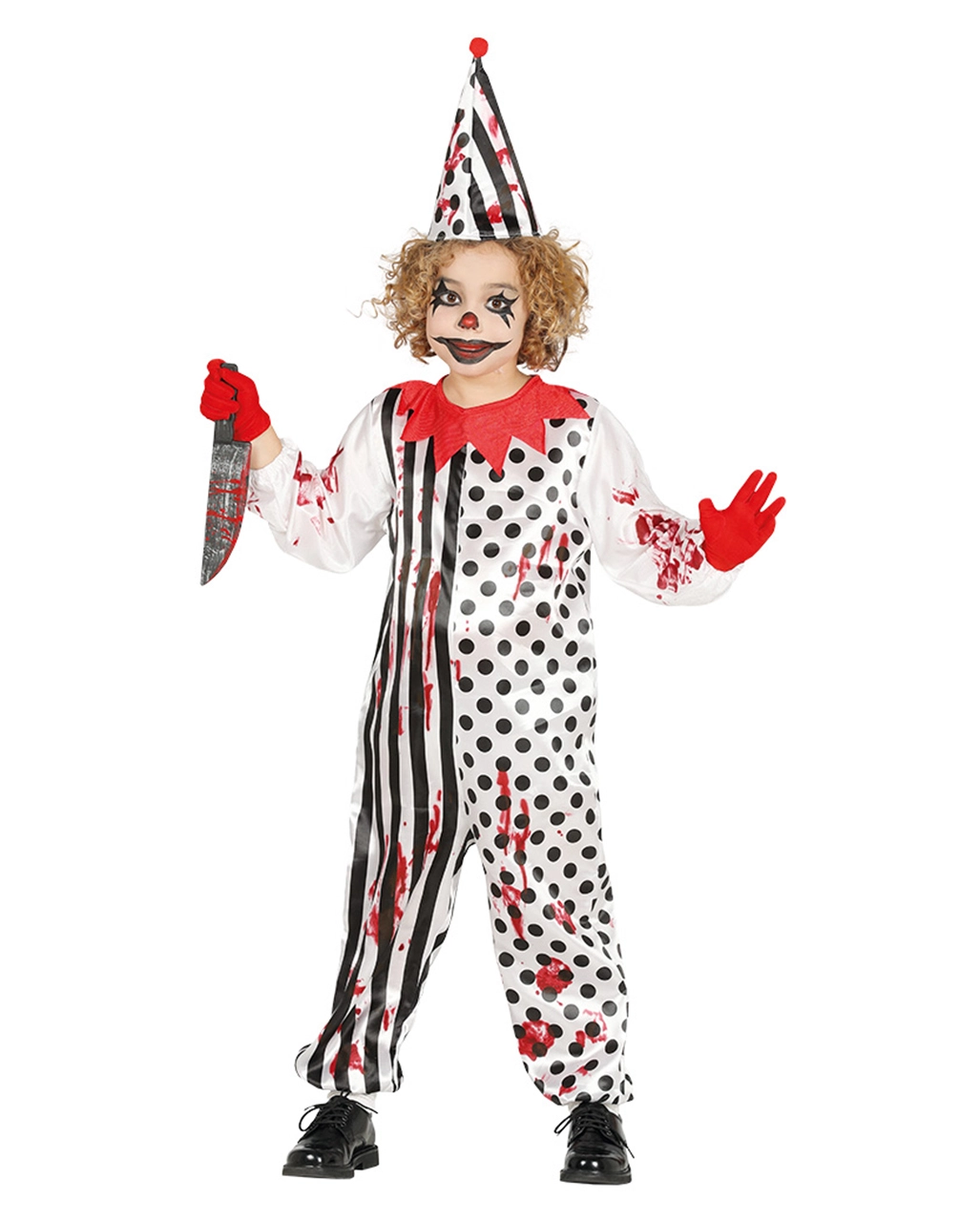 Schon gewusst? Auch Killer-Clowns haben Kinder. Diese stehen ihren Eltern in ihrer Blutrünstigkeit in nichts nach. Eiskalt, und immer auf der Suche nach dem nächsten wehrlosen Opfer, machen die Kids zu Halloween die finsteren Straßen unsicher. Das Killer-Clown Kinderkostüm verwandelt deinen Nachwuchs in einen tyrannischen Killer-Clown. Lass es am 31.Oktober im Killer-Clown Kinderkostüm von Tür zu Tür gehen und die Nachbarn erschrecken!