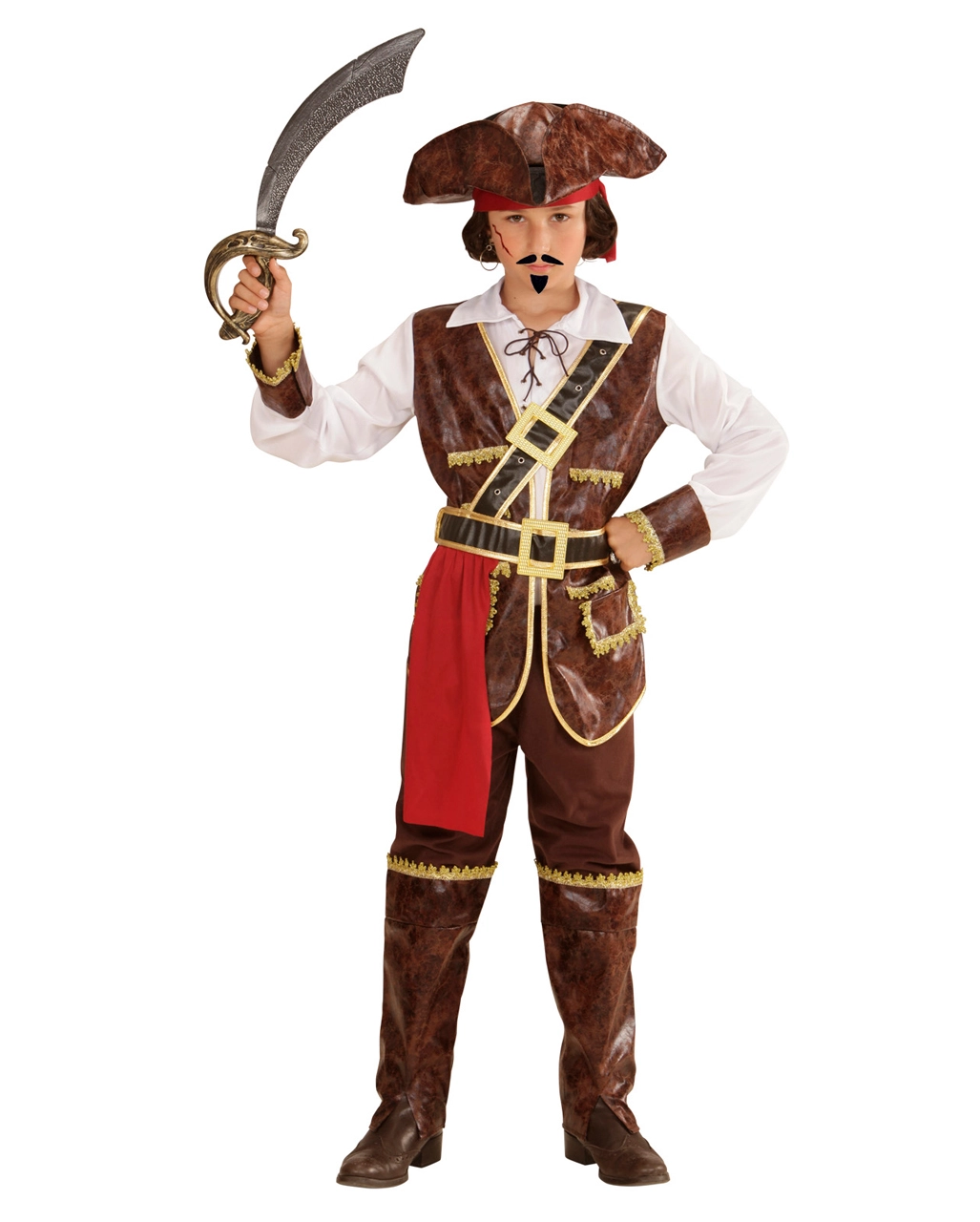 - Inhalt: 1 Hemd mit angenähter Weste, Hose mit angenähten Stiefelstulpen, Gürtel, Schärpe, Piratenhut