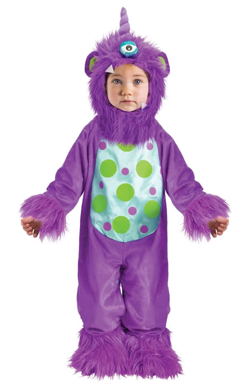 Das Kleine Lila Monster Babykostüm besteht aus einem Overall und einer Kapuze. Der Overall ist aus einem kurzhaarigen fellartigen Material in lila, an den Händen und den Füßen ist zotteliges lila Kunstfell. Vom hals bis zum Bauch ist ein weißer glänzender Stoff mit grünen und lila Punkten aufgenäht. Der Overall hat Druckknöpfe am Rücken zum leichten an- und ausziehen und an den Beinen zum Monsterwindel wechseln. Die lila Plüsch-Kapuze mit einem Auge, zwei Zähnen und einem Horn des Monsters ist auch aus lila Zottelfelll, die beiden Ohren sind innen grün. Weitere Kuschel-Kostüme für Babys sind das Angry Birds Babykostüm rot, das Plüsch Tiger Babykostüm Gr. S und das „Chili Pepper“ Babykostüm.