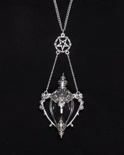 Die Kuss des Todes Fläschchen Halskette KILLSTAR ist ein echter Hingucker. Die lange silberne Gothic Kette besticht durch einen extravaganten Anhänger, der ein transparentes Fläschchen als Herzstück hat. Der Anhänger ist reichlich mit floralen Mustern verziert und als weiteres Highlight befindet sich oberhalb des Fläschchens ein weiteres Element. Ein silbernes Pentagramm lässt darauf schließen, dass du vielleicht doch einen Zaubertrank in deinem Gothic Halsschmuck verborgen trägst.