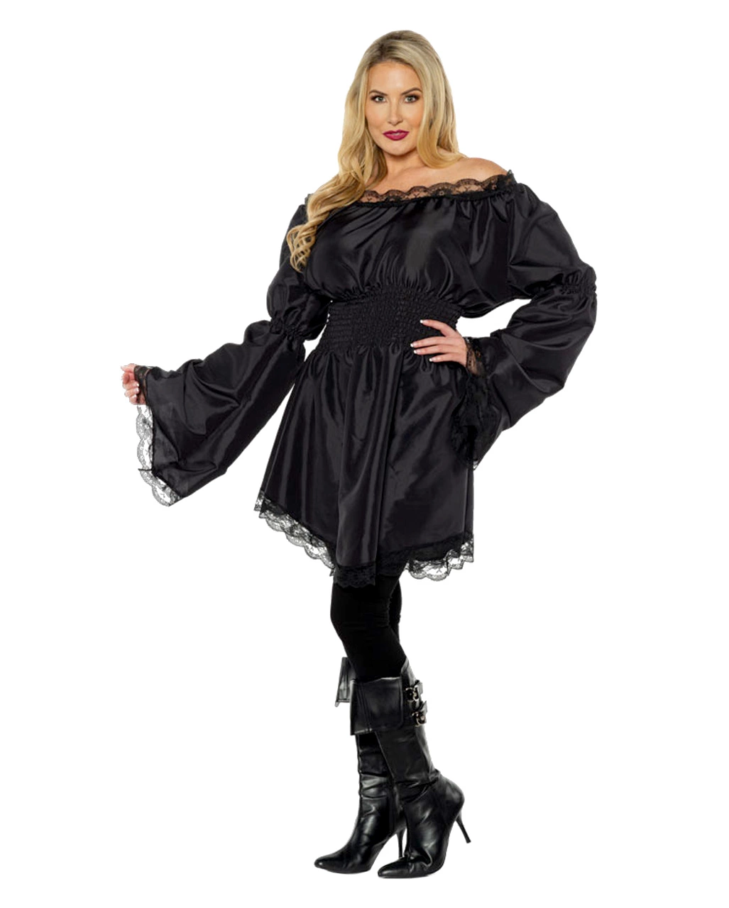 Das ist nur ein Grund dafür, warum die Longshirt Rüschenbluse schwarz in keinem Kostümschrank fehlen sollte. Vielseitig kombinierbar besitzt die Kostümbluse viele tolle Details, die das Mix & Match Zubehör zum optischen Highlight werden lassen. Da wären zum einen die weiten Trompetenärmel und die feinen Rüschen aus Spitze. Diese befinden sich an Ärmeln und Ausschnitt. Außerdem kannst du den Ausschnitt leicht variieren, so dass die Schultern freiliegen. Eine riesen Auswahl an idealen Accessoires für deine Verkleidung findest du hier im Shop.
