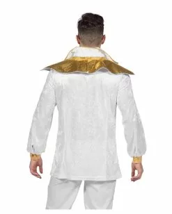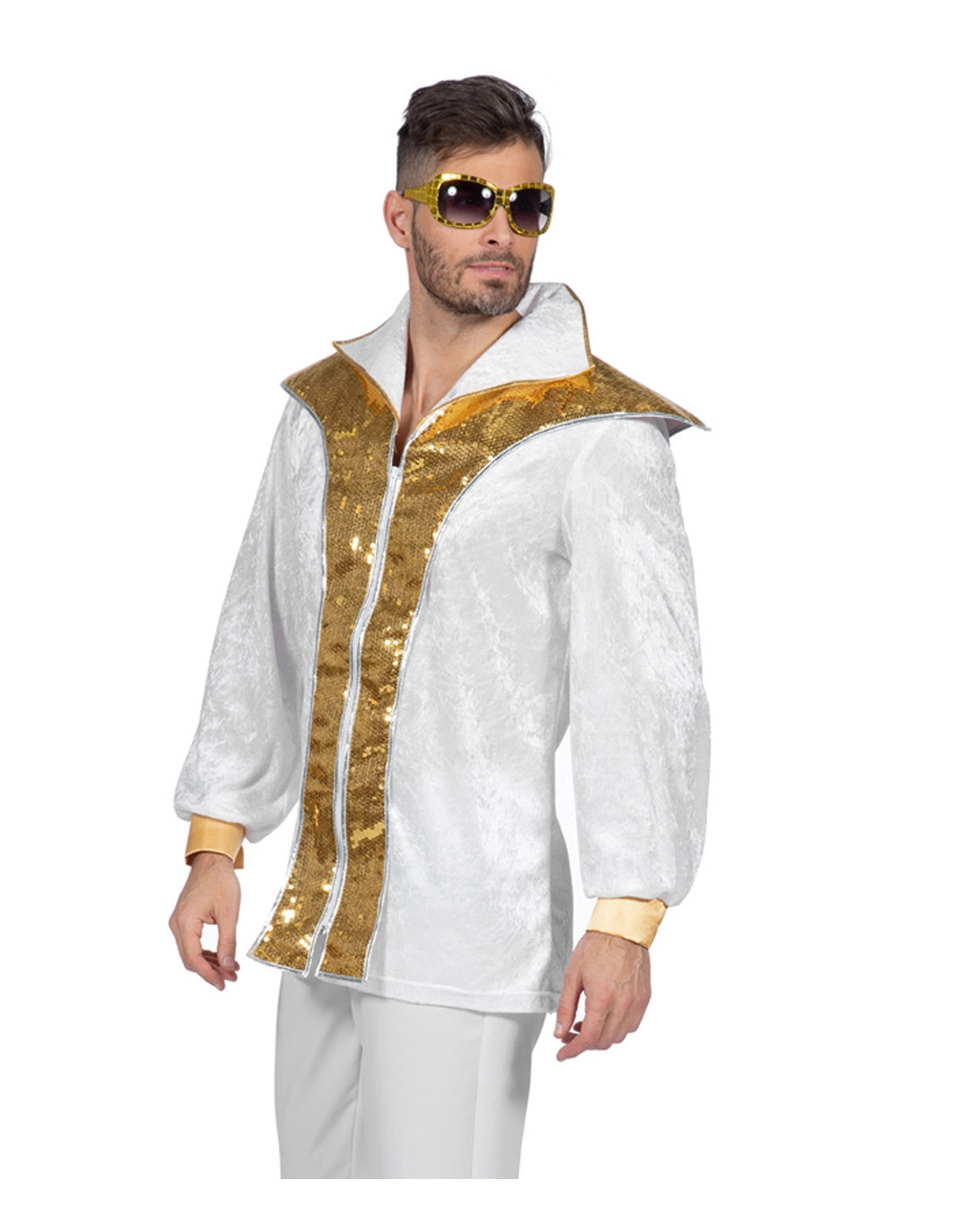 Das Mama Mia 70er Jahre Männerhemd ist sowohl auf der 70er Jahre Motto Party, als auch an Karneval eine perfekte Basis für einen stilsicheren Popstar Auftritt.Das extravagante weiße Oberteil mit goldenen Applikationen am großen Kragen, macht dich zum schillernden Blickfang. Wo immer du Gold-Hemd auch trägst, als echte Rampensau ist dir die Aufmerksamkeit gerade recht. Passend dazu kannst du dein 70s Outfit noch mit der Blonde Herrenperücke Knut Deluxe krönen.