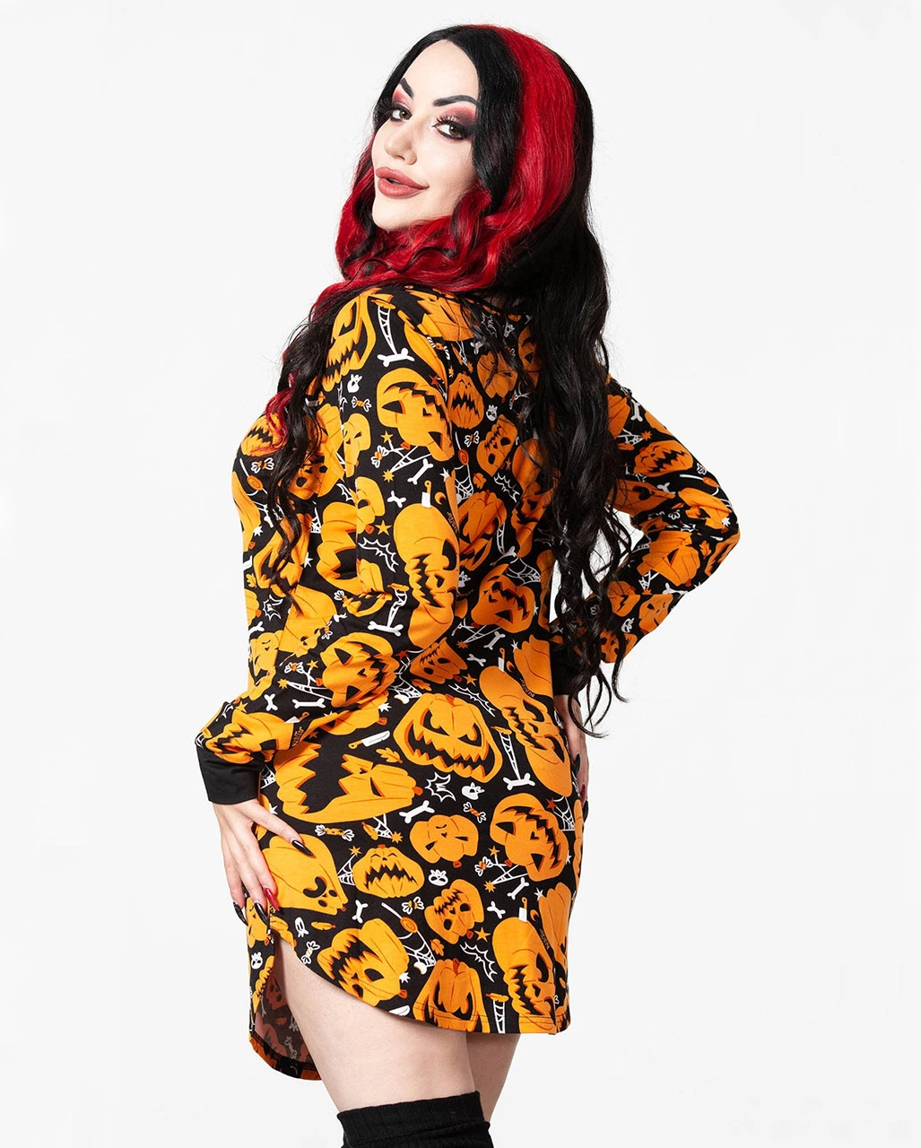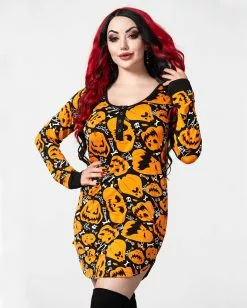 In diesem sexy Fummel bist du an Halloween sicher nicht zu übersehen. Zeige dich im sexy Kürbis Minikleid von KILLSTAR und verwandle dich in die heiße Pumpkin Queen! Das Night Harvest Henley Kleid von KILLSTAR sorgt mit spooky Kürbisfratzen für Aufsehen und lässt jedes Monster schwach werden. da spendieren dir Dracula, Werwolf & Co. gerne mal ´nen Drink. Das kurze Kürbis Kleid mit langen Ärmeln präsentiert sich im wilden Kontrast-Druck und lässt sich super anstelle eines Halloween Kostüms tragen. Wahlweise könntest du natürlich auch passende Accessoires, wie Kopfschmuck oder Maske dazu kombinieren. Alles hierfür findest du in unserem Onlineshop.