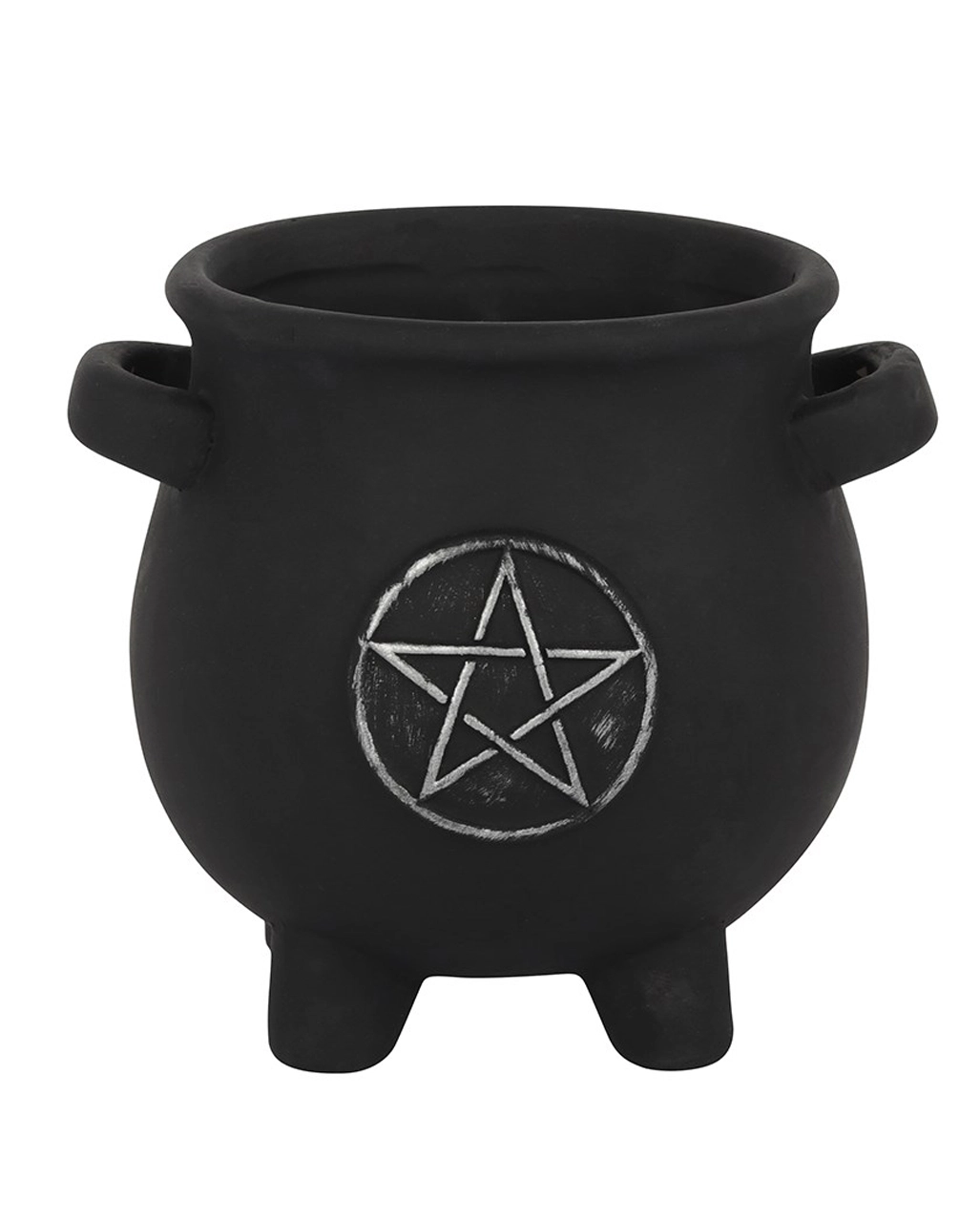 Du erhältst unseren Pentagramm Hexenkessel Pflanzenbehälter mit den Maßen 13 x 12 x 11 cm. Der Dekoartikel besteht aus schwarzem Terrakotta und ist mit einem weißen Pentagramm verziert. Neben dem okkulten Pflanzkübel findest du bei uns auch die Schwarzer Hexenkessel Duftöl Brenner