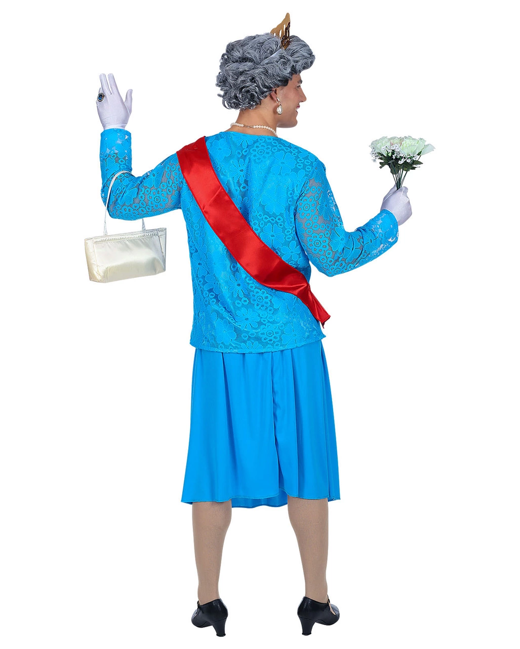 Das Queen Elizabeth Herrenkostüm ist seinem realen Vorbild täuschend echt nachempfunden. Die blaue Bluse sowie der ebenfalls blaue Rock als elegantes Gewand für offizielle Anlässe wird von der Karnevals-Verkleidung treffend kopiert. Die rote Schärpe mit goldenen Verzierungen und die weißen Handschuhe fügen sich stimmig in das Bild der Königin von England ein. Eine goldene, an ein Diadem erinnernde Krone und eine weiße Handtasche als charakteristische Accessoires runden deinen Auftritt als Queen Elizabeth stimmig ab. Dazu empfehlen wir Klassische Perlenohrringe und den Rosa-weißer Kunst Blumenstrauß.