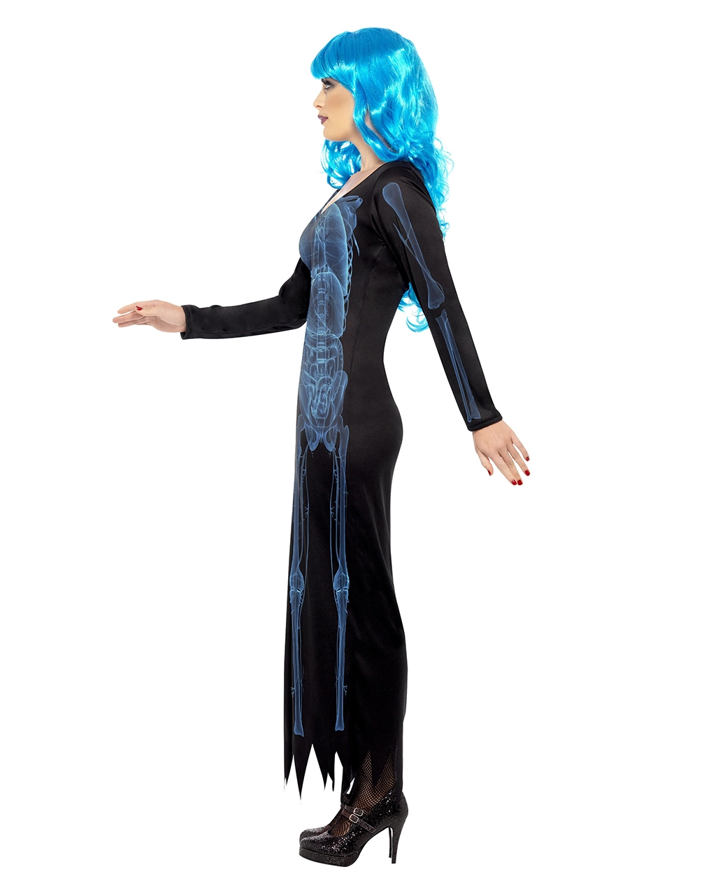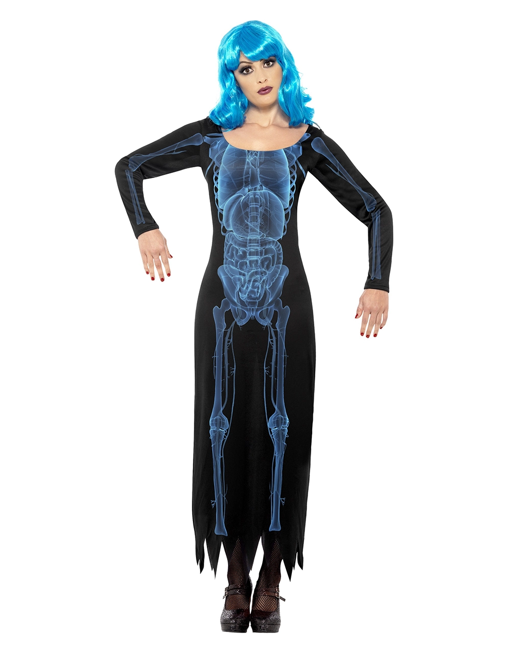 Das Röntgen Frauen Kostüm ist ein schwarzes, langes und eng anliegendes Kleid mit dem Aufdruck einer Röntgenaufnahme des ganzen Körpers außer Kopf, Händen und Füßen. Das Kleid ist knöchellang und hat unten einen zackigen Saum. Der Aufdruck ist in einem hellen, transparenten Blau-Grau, wie es für Röntgenaufnahmen typisch ist. Man sieht neben den Knochen auch innere Organe und die wichtigsten Adern. Mit je einem Paar Schwarze Skelett Pumps mit Knochenmotiv und Skelett Handschuhe weiß sowie der Skull and Bones Maske kannst du den Durchblick noch verbessern.