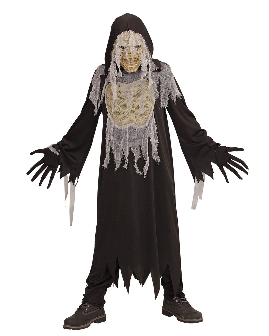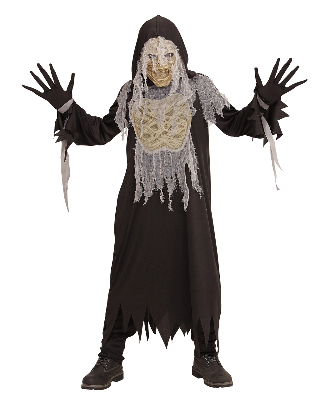 Das Schreckliche Mumie Kinderkostüm macht seinem Namen alle Ehre. So ein Halloween Mumien Kostüm ist nämlich ziemlich schrecklich anzusehen. Die Robe der Halloween Verkleidung für Kinder hängt in Fetzen, was dafür spricht, dass du einige Jahre im Grab gelegen hast. Die Handschuhe, die zu dem Geister Kinder Kostüm gehören, lassen deine Finger lang und spitz aussehen. Highlight des gruseligen Trick or Treat Verkleidung ist die Maske, die ein schauderhaftes Mumiengesicht zeigt.