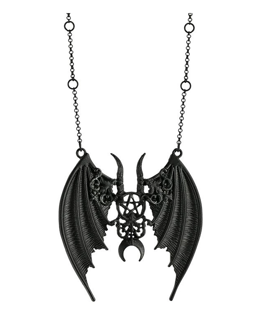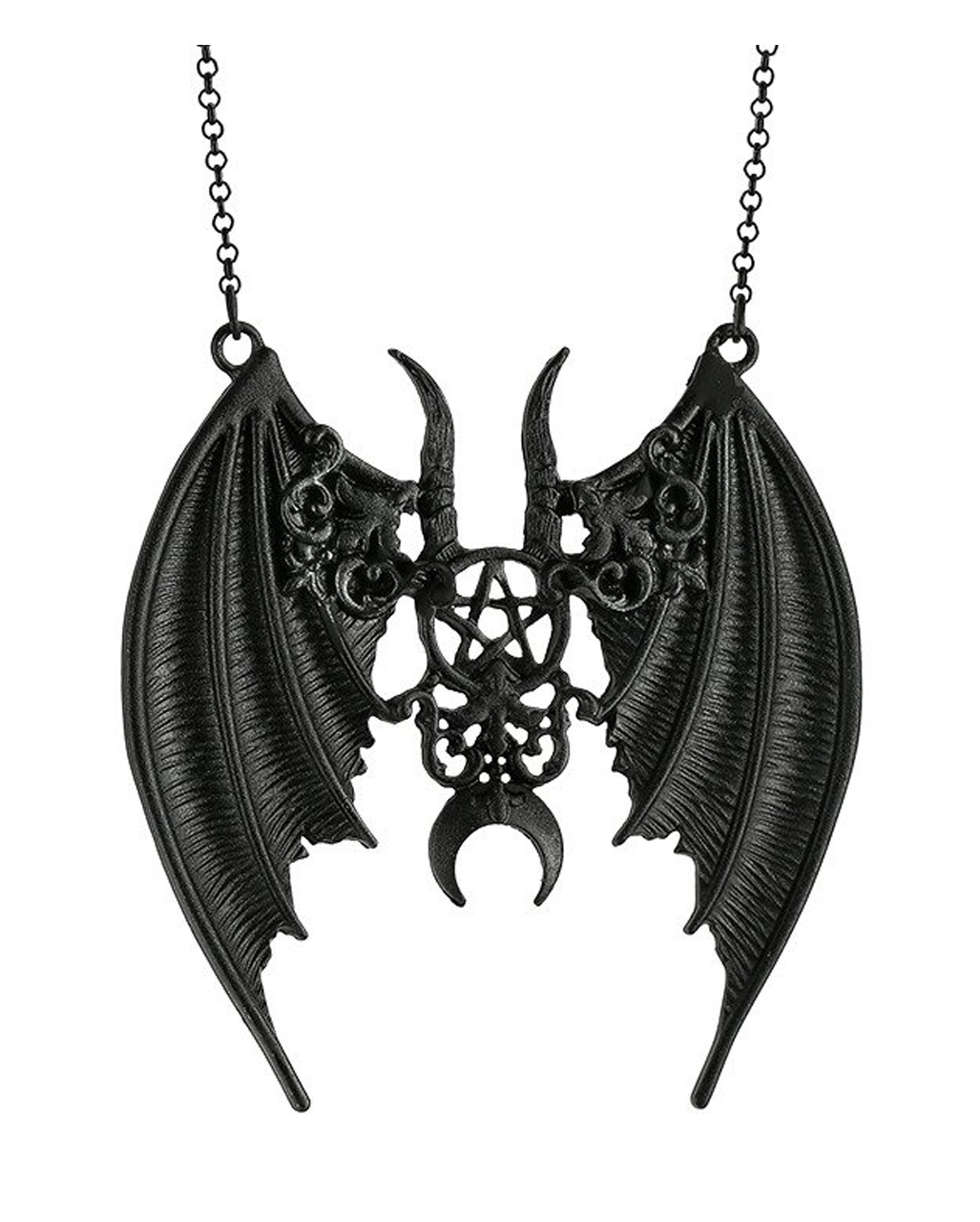 Die schwarze Maleficent Gothic Halskette ist eine spektakuläres Accessoires mit Fledermaus-Flügeln. Mittig ist ein schöner Rahmen mit einem Halbmond, Pentagram & Teufelshörnern angebracht. Die großen Flügel sind an Pentagram und detaillierten einzigartigen Ornamenten befestigt. Der Gotik Halsschmuck ist eine tolle Geschenkidee für Geburtstage & Weihnachten.