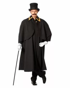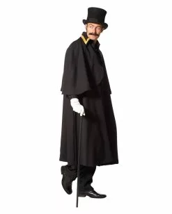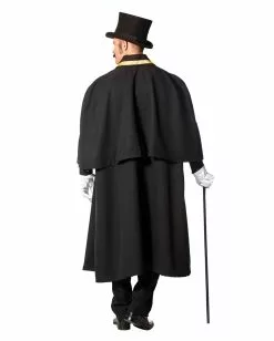 Der schwarze Kostüm Kutschermantel weist ein edles Design auf. Großzügig geschnitten und mit der charakteristischen Pelerine versehen, sorgt die goldene Ziernaht am Kragen des Kutscher-Umhangs für einen eleganten Look. Durch die schlichte Farbgebung fügt sich der Kostüm-Mantel perfekt in jede Verkleidung für Halloween ein und vollendet deine Kostümierung bei WGT, MPS und LARP-Events. Dazu passen ein Herren-Zylinder schwarz und die Weiße Kostümhandschuhe für Erwachsene.