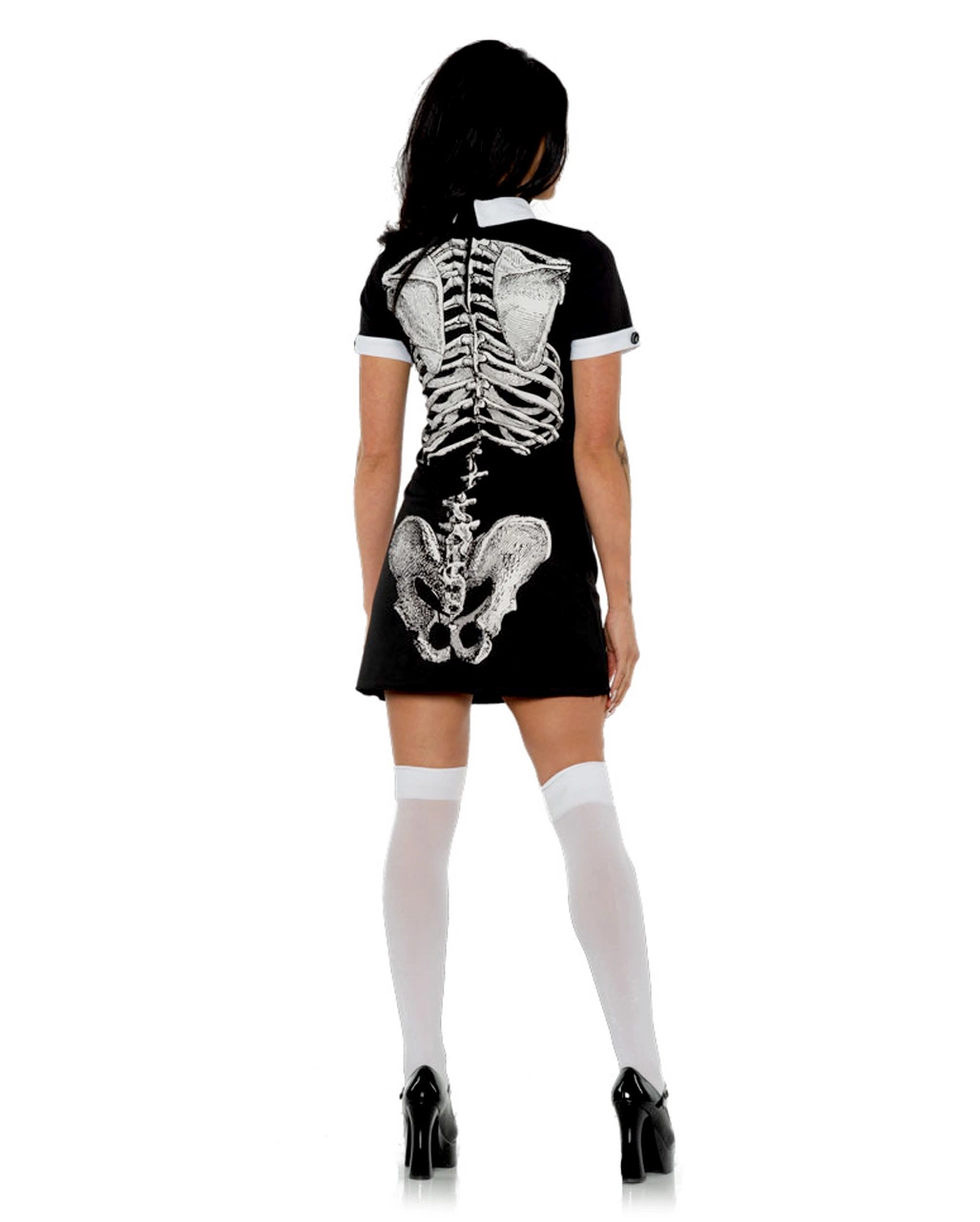 Mit dem Skelett Kurzarmkleid mit Kragen bist du auf der Hingucker schlechthin auf der Halloween Party. Das sexy Kleid, das kurz über dem Hintern endet, macht Dich zum spooky Schmuckstück jeder Geisterparty. Präsentiere deine Hüftknochen und deine Rippen und rocke die Motto Party, bis die Knochen knacken.