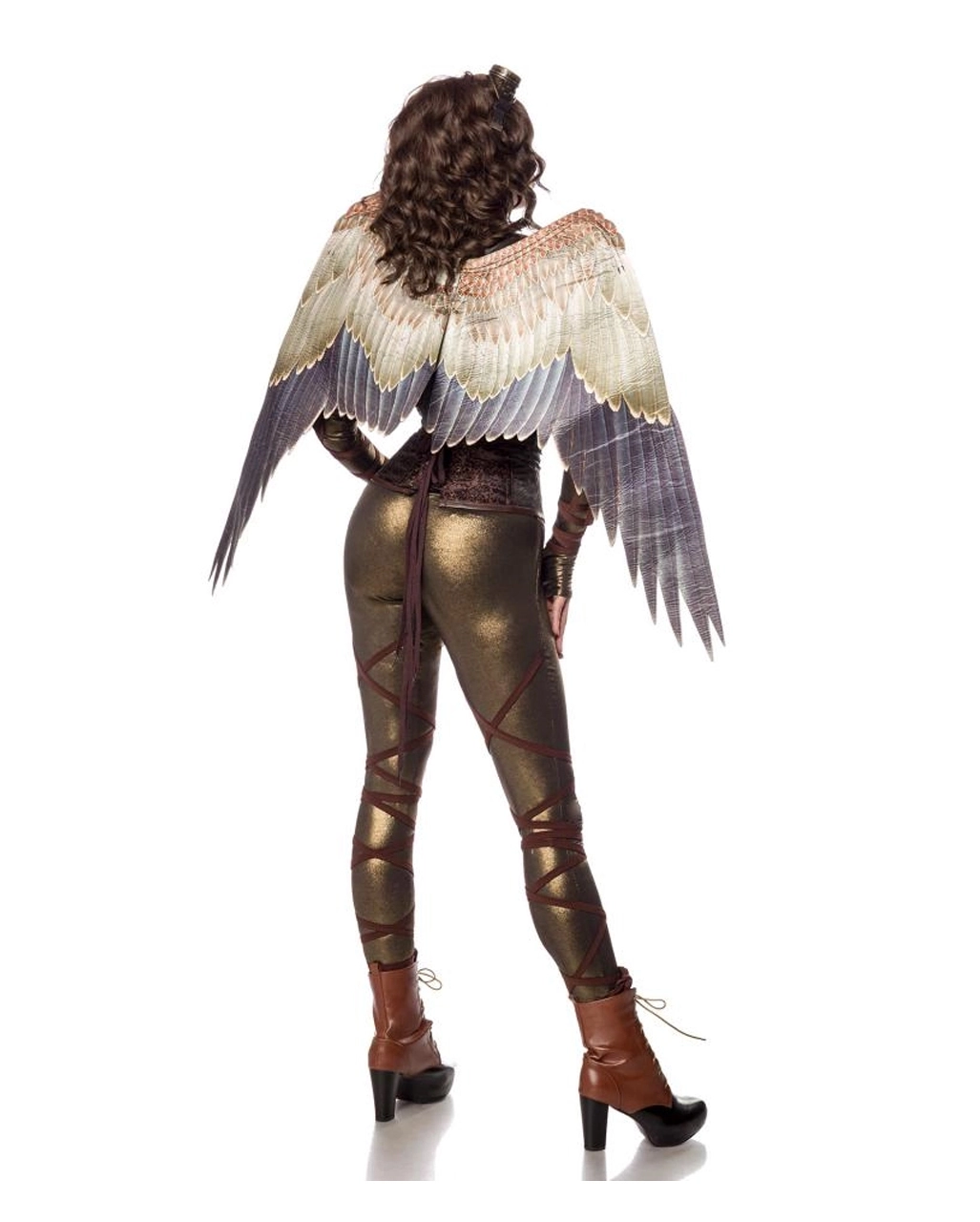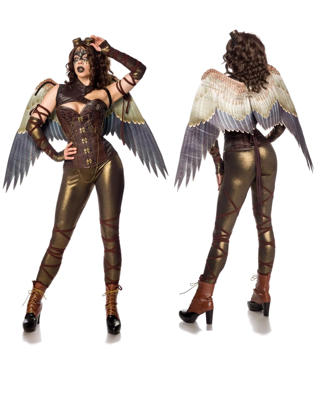 Unser Steampunk Angel Fighter Frauenkostüm besteht aus Corsage, bedruckten Flügeln, Schulterteil, einer goldfarbenen Fliegerbrille, ellbogenlangen Handstulpen mit Schnüren und den goldschimmernden Leggings. Perücke und Schuhe nicht inklusiv.
