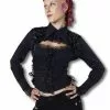 Das bezaubernde braune Steampunk Jäckchen in Lederoptik wird vorne mit drei Knöpfen verschlossen. Er hat einen kleinen kecken Stehkragen und im Bereich der Arme auf jeder Seite und hinten und vorne je fünf goldene Lochnieten als Verzierung. Über die Arme reichen Volants in Lederoptik und braune Spitze mit Blütenornamenten herab. Auf dem Rücken kann der Bolero noch geschnürt und in Form gebracht werden. Kombinieren kannst du ihn mit dem Viktorianischer Miederrock und dem Steam Punk Edel Vampir Kostüm.