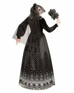 Das Tag der Toten Skelettbraut Kostüm ist ein schwarzes Gothic Kostüm, das in Größe S-L verfügbar ist. Es besteht aus einem Kostümkleid mit Reifrock sowie einem dunklen Brautschleier. Kleine silberne Totenschädel-Ornamente und winzige Fledermäuse bilden einen schönen Kontrast zum schwarzen Kleid. Im Brustbereich und auf den Ärmeln befindet sich ein Skelett-Print, der den Horror-Look verstärkt. Zu diesem Skelett Damen Kleid passt unser Tag der Toten Schmink Set und ein Schwarzer Rosenstrauß als Kostümzubehör.