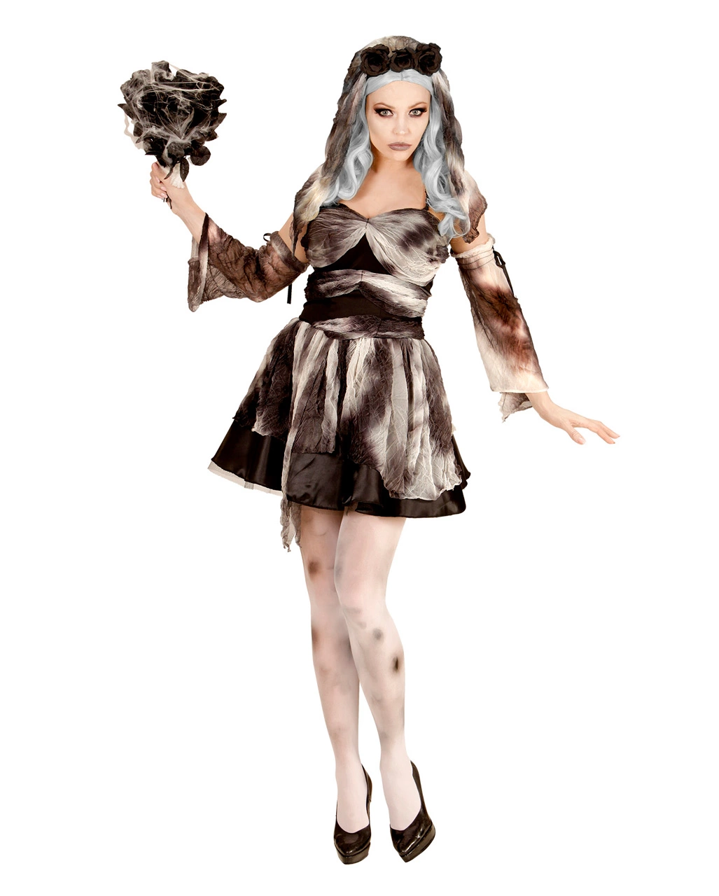 Das hübsche kurze Kleid unseres Totenbraut Kostüm mit Schleier zeigt deine sexy verwesten Beine, denn es reicht kaum bis zum Knie. Da niemandem sonst der Tod so gut steht wie dir, kannst du es tragen. Das Kleid sieht aus, als würdest du schon ein paar Jahre darin herumwandeln, aber auch das tut der untoten Braut keinen Abbruch. Die passenden Armbänder und der hübsche Kopfschmuck mit schmutzigem Brautschleier machen das Braut Outfit für Fasching und Halloween perfekt. Für das Gesicht empfehlen wir dasKarneval Basic Make-up grau.