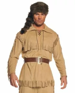 Die Trapper Verkleidung besteht aus einem Hemd und einer Hose aus Kunstleder sowie aus einem Gürtel und einer Trapper Mütze. Das Hemd wird vorne mit einer Schnürung verschlossen, an den Armen, am Saum, an den Schultern und an der Brust hat das Hemd Lederfransen. Auch die Hose ist an der Außennaht mit Fransen verziert. Der Gürtel hält mehr das Hemd zusammen als die Hose oben, das erledigt ein Gummizug im Hosenbund. Die typische Bieber-Mütze vervollständigt das Kostüm. Der Trapper braucht noch einen Krieger Tomahawk, die Indianer Halskette und dazu ein Trapper Bart braun.