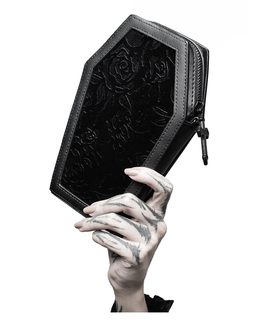 Die Vampir´s Kiss Sarg Geldbeutel KILLSTAR ist mehr als ein bloßer Geldbeutel. Es ist ein extravagantes Gothic Mode Accessoire. Mit der Geldbörse in Sarg Form vervollständigst du deinen morbiden Look. Die Sarg-Geldbörse ist eine dunkle Kombination aus luxuriösem Kunstleder und maßgeschneidertem, gebraucht aussehenden Burnout-Samt. Sie ist komplett in einem eleganten Sarg-Design gehalten und damit die perfekte Brieftasche für jeden Vampir! Sie ist außerdem mit einem Reißverschluss und einem Fledermaus Emblem versehen. Groß, aber dennoch leicht, bietet sie Platz für Bargeld, Dokumente und magische Amulette. Passend dazu findest du bei uns die Gothic Handtasche in Sarg Form.