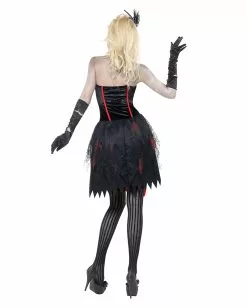 Das Zombie Burlesque Damen Kostüm ist ein schwarz-rotes, kurzes Kleid. Das Kleid ist ein Neckholder Kleid, mit zwei roten Bänder wird es im Genick mit einer Schleife verschlossen. Das korsettartige Top ist aus schwarzem Samt-Imitat mit verkrusteten Blutflecken. Vom oberen roten Saum gehen vorne drei und hinten zwei rote Zierborten senkrecht hinunter bis zum Rock. Das kurze Röckchen besteht aus einem Unterrock aus schwarzem Stoff und einem Überrock aus schwarzer, blutbespritzter Spitze. Der Überrock ist hinten länger als vorne. Der Unterrock ist zackig ausgefranst. Mit den Schwarze Nylons mit weißer Spitze und Schleife, den Zombie Motivlinsen und einem Paar High Heels mit Spitze wird die untote Tänzerin perfekt.